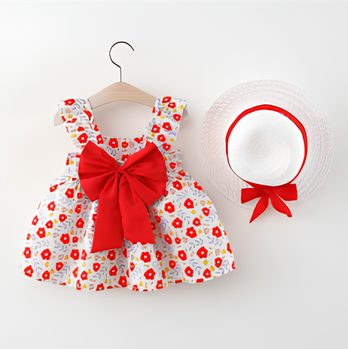 The Cherry Meadow Edition brings together blooming florals, a bold red bow, and a ready hat — made for festive gatherings, or simply letting your little one shine in style.