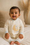 Design: Soft blue body with cream cuffs and collar + sleeping bear sitting on a crescent moon