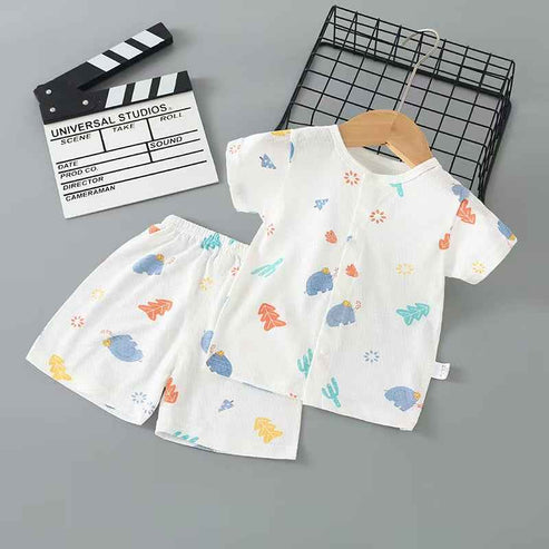 Keep your little explorer cool, comfy, and full of cheer with our Jungle Friends Co-ord Set. Featuring a breezy short-sleeved top and easy-fit shorts, this outfit is perfect for days filled with play, naps, and cuddles. Printed with adorable jungle elements like elephants, leaves, and florals in a soft pastel palette, this set is a must-have in your baby's wardrobe.