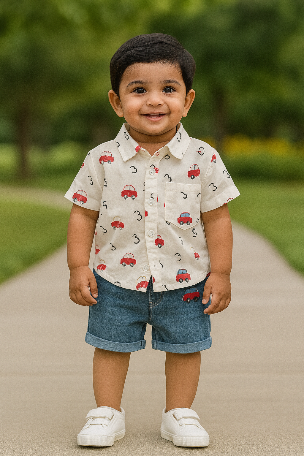 Top: Crisp white short-sleeve shirt with red car & doodle print, front button-down, and chest pocket